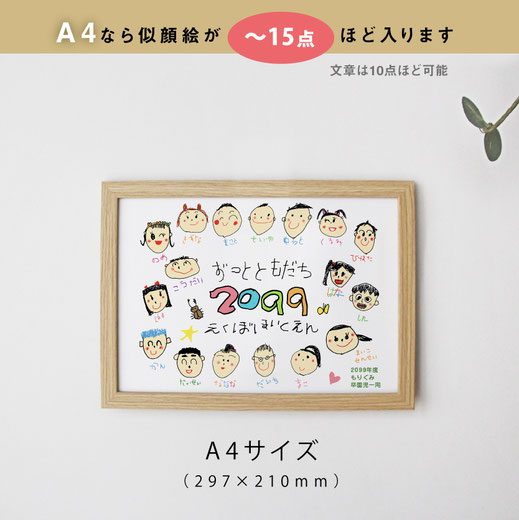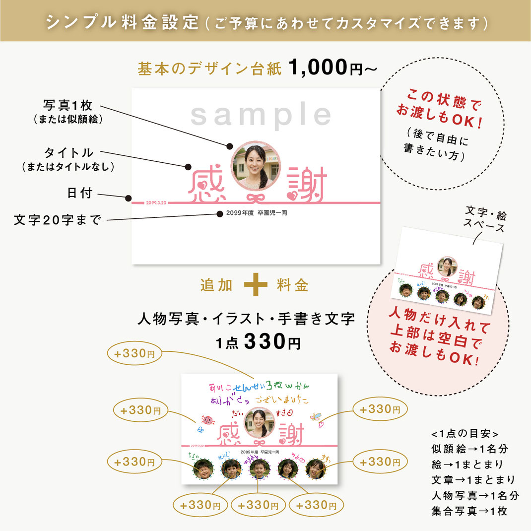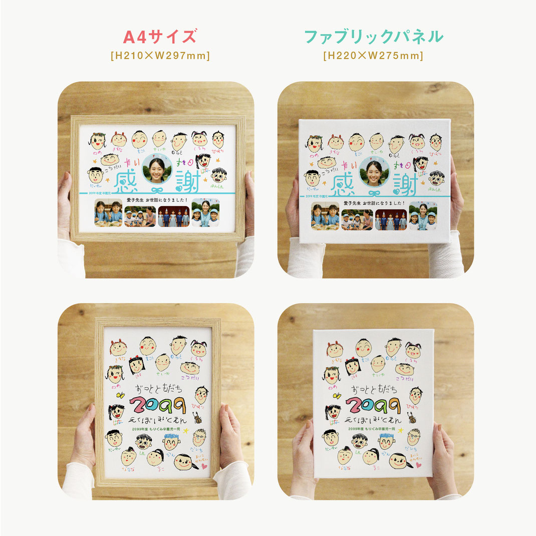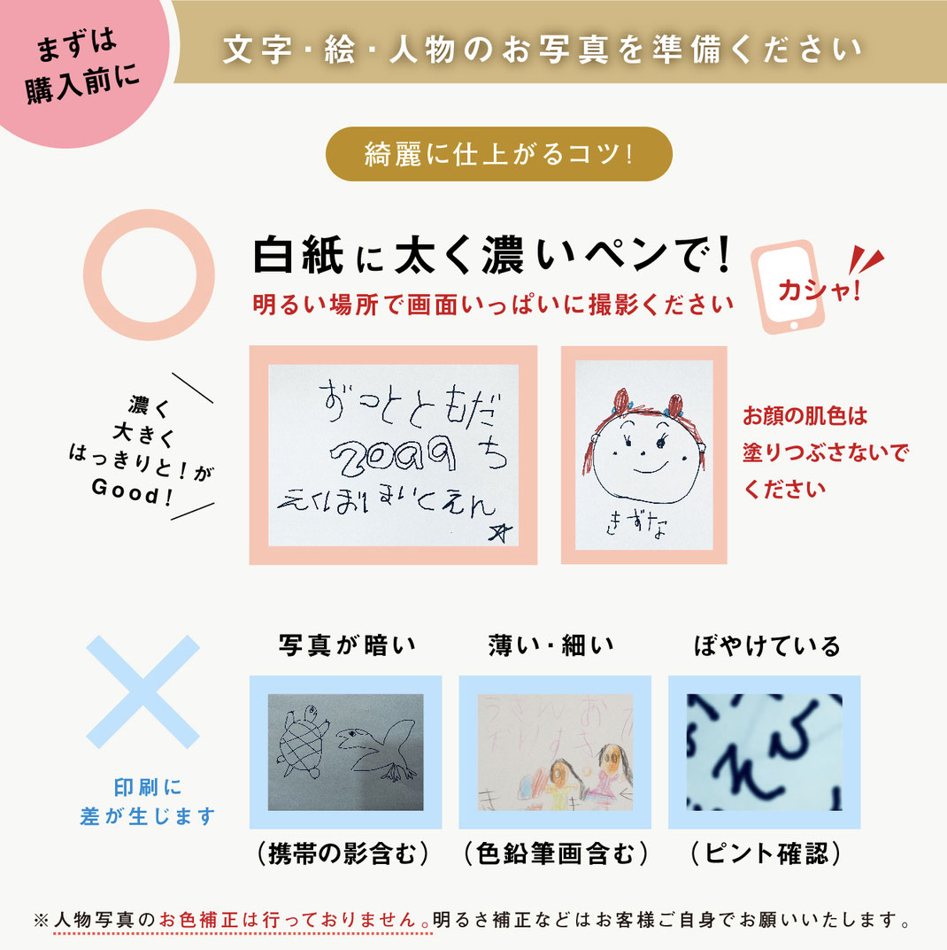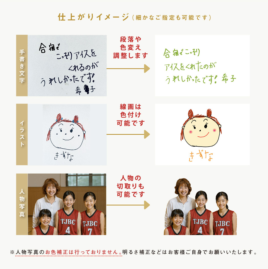 手書き文字、おえかきイラスト、似顔絵、園や学校での思い出写真、部活の集合写真など